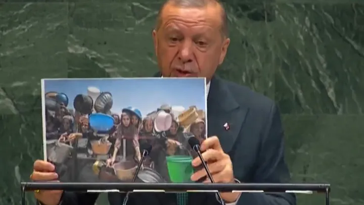 Kürsüden, Gazze'deki günlük hayatı anlatan bir fotoğraf gösteren Erdoğan, 'Birinci fotoğraf gördüğünüz gibi ellerinde leğenli kadınlar. Lütfen hepimiz elimizi vicdanımıza koyup cevap verelim. 2025 yılında böyle bir gaddarlığın makul bir sebebi olabilir mi? Fakat insanlık adına bu utanç manzarası Gazze'de 23 aydır her gün tekrar ediyor. 365 km2 içinde yaşayan 2.5 milyon Gazze'li her gün yerinden eziliyor. Her gün bir başka bölgeye göçe zorlanıyor.' diye açıkladı.