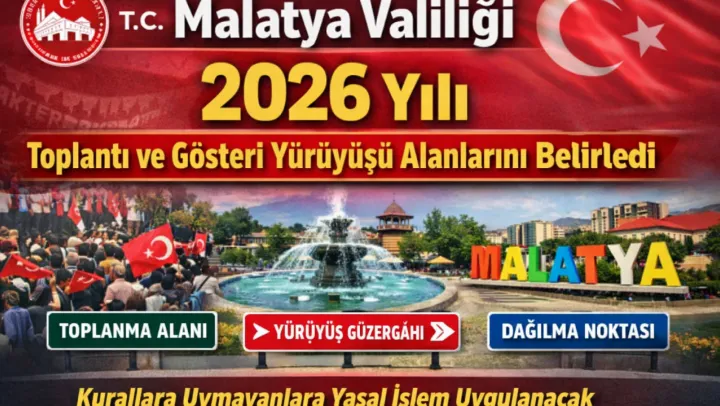Malatya Valiliği, 2911 sayılı Toplantı ve Gösteri Yürüyüşleri Kanunu ile ilgili yönetmelik hükümleri doğrultusunda 2026 yılı için Yeşilyurt ve Battalgazi ilçelerinde toplantı ve gösteri yürüyüşü yapılabilecek alanları, güzerghları, toplanma ve dağılma noktalarını açıkladı.