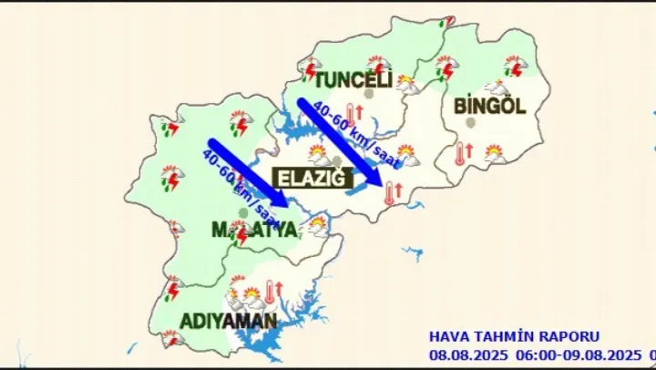 Bölgemiz genelinde havanın parçalı ve az bulutlu; öğle saatlerinden itibaren Malatya çevreleri ile Adıyaman'ın kuzey ve batısı ile Tunceli ve Bingöl'ün kuzey kesimlerinin yerel olmak üzere sağanak ve gök gürültülü sağanak yağışlı olarak geçmesi tahmin edilmektedir.