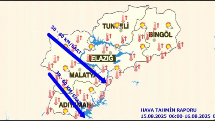 RÜZGAR: Rüzgarın kuzey ve batı yönlerden orta kuvvette, yer yer kuvvetli (40-60 km/sa); yarın (cuma) Malatya'nın güney, Adıyaman'ın kuzey kesimlerinde zaman zaman kısa süreli fırtına şeklinde eseceği tahmin edilmektedir.