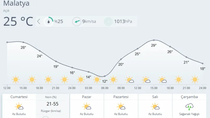 Haftanın en önemli değişikliği ise çarşamba günü yaşanacak. Meteoroloji raporuna göre, Malatya'da sağanak yağış bekleniyor. Sıcaklık ise en düşük 11, en yüksek 26 derece olacak.