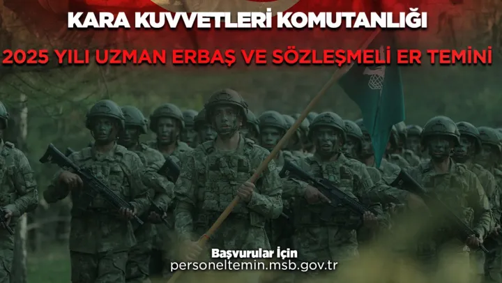 Milli Savunma Bakanlığı, 2025 yılı Kara Kuvvetleri Komutanlığı Uzman Erbaş ve Sözleşmeli Er temin faaliyetleri için başvuruların açıldığını duyurdu.