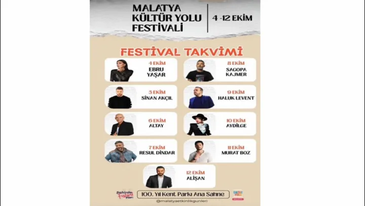 Malatya, bu yıl ilk kez Kültür Yolu Festivali'ne ev sahipliği yapacak. 4-12 Ekim tarihleri arasında gerçekleştirilecek festivalde konserler, sergiler, gösteriler, söyleşiler, gastronomi etkinlikleri ve atölye çalışmaları şehrin dört bir yanında vatandaşlarla buluşacak.