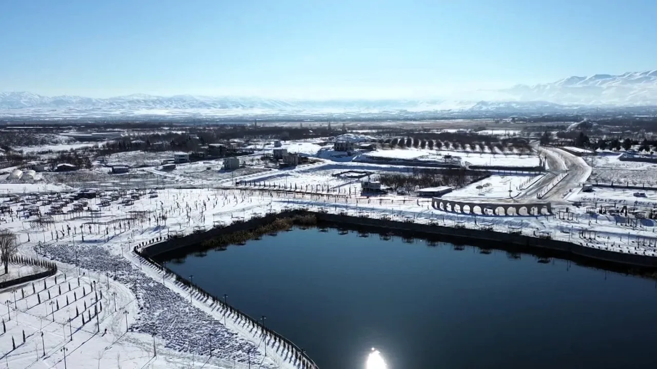 Dron ile havadan görüntülenen Battalgazi’de, beyaz örtünün tarihi dokuyla buluşması dikkat çekti. Özellikle kış mevsiminde sessizliğe bürünen kayısı bahçeleri ve Karakaya Barajı manzarası, izleyenlere görsel şölen sundu.