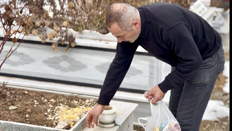 MALATYA (MHA) - Kahramanmaraş merkezli 6 Şubat depremlerinde Malatya’da Yıkılan Kasapoğlu Apartmanı’nda eşi ve dört çocuğunu kaybeden Turgut Karaaslan, fırsat buldukça geldiği mezarlıkta çocuklarının sevdiği çikolataları mezar başına bırakıyor, mezar taşlarını öperek onlarla konuşuyor.