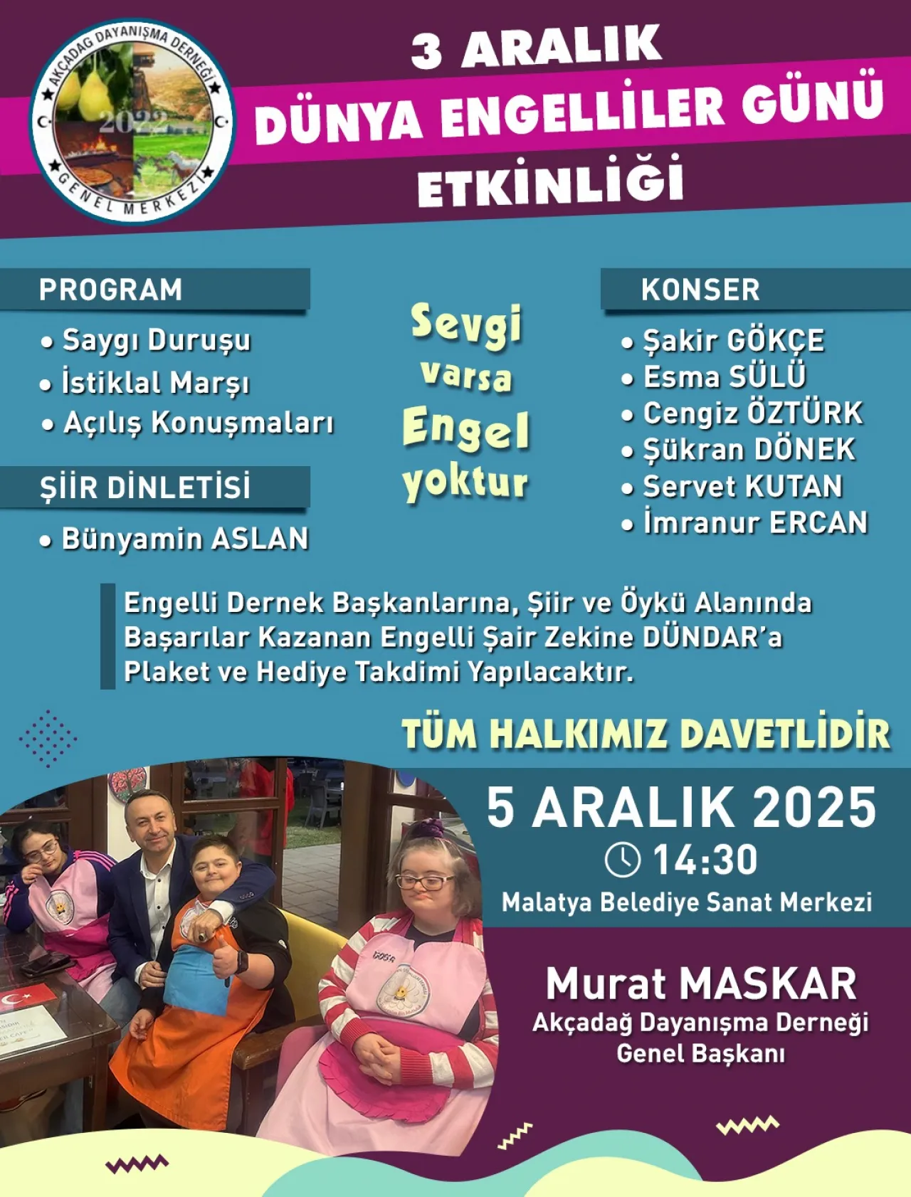 Akçadağ Dayanışma Derneği, 3 Aralık Dünya Engelliler Günü dolayısıyla kapsamlı bir etkinlik düzenliyor. Program, 5 Aralık 2025 tarihinde saat 14.30’da Malatya Belediyesi Sanat Merkezinde gerçekleştirilecek.