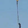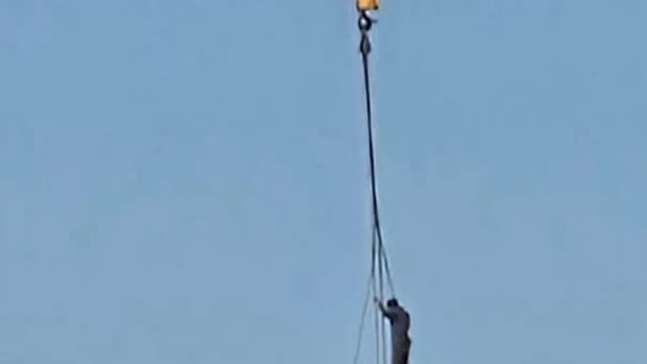İnşaat malzemelerinin taşınması için kullanılan kule vincin halatlı sepetine tutunan bir işçinin aşağıya inmesi, bir vatandaş tarafından cep telefonuyla kaydedildi.