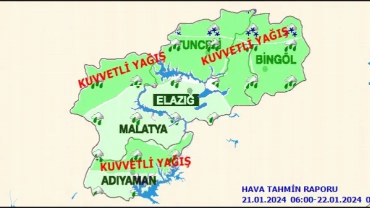 Bölge genelinde havanın çok bulutlu; aralıklı yağışlı geçeceği, yağışların Tunceli Bingöl çevreleri, Malatya’nın ve Adıyaman’ın kuzey kesimleri (Kuluncak, Hekimhan, Arguvan, Arapgir, Gölbaşı, Tut, Adıyaman Merkez, Çelikhan, Sincik, Kahta, Gerger) ile Elazığ’ın kuzey ve doğu kesimlerinde (Ağın, Keban, Karakoçan, Kovancılar, Palu, Alacakaya, Arıcak) yer yer kuvvetli (21-50 kg/m2) olacağı tahmin edilmektedir. Genellikle yağmur, 1200 m üzeri rakımlı kesimlerde karla karışık yağmur ve yer yer yoğun kar (20 cm üzeri) şeklinde olması beklenmektedir.