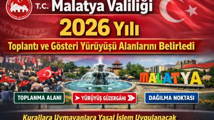 Malatya Valiliği, 2911 sayılı Toplantı ve Gösteri Yürüyüşleri Kanunu ile ilgili yönetmelik hükümleri doğrultusunda 2026 yılı için Yeşilyurt ve Battalgazi ilçelerinde toplantı ve gösteri yürüyüşü yapılabilecek alanları, güzergâhları, toplanma ve dağılma noktalarını açıkladı.