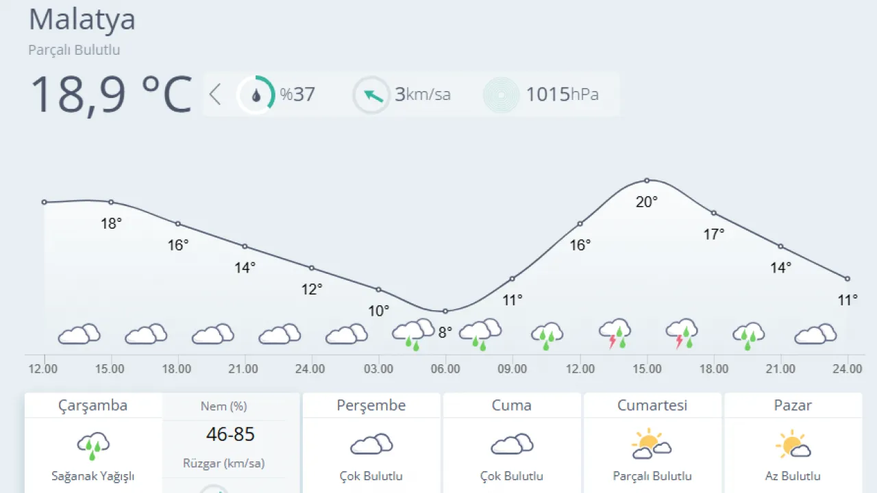 MALATYA (MHA) - Malatya’da gün içerisinde hava parçalı bulutlu geçerken, sıcaklık 18.9 derece olarak ölçüldü. Meteoroloji verilerine göre, akşam saatlerinden itibaren kent genelinde sağanak yağış bekleniyor.