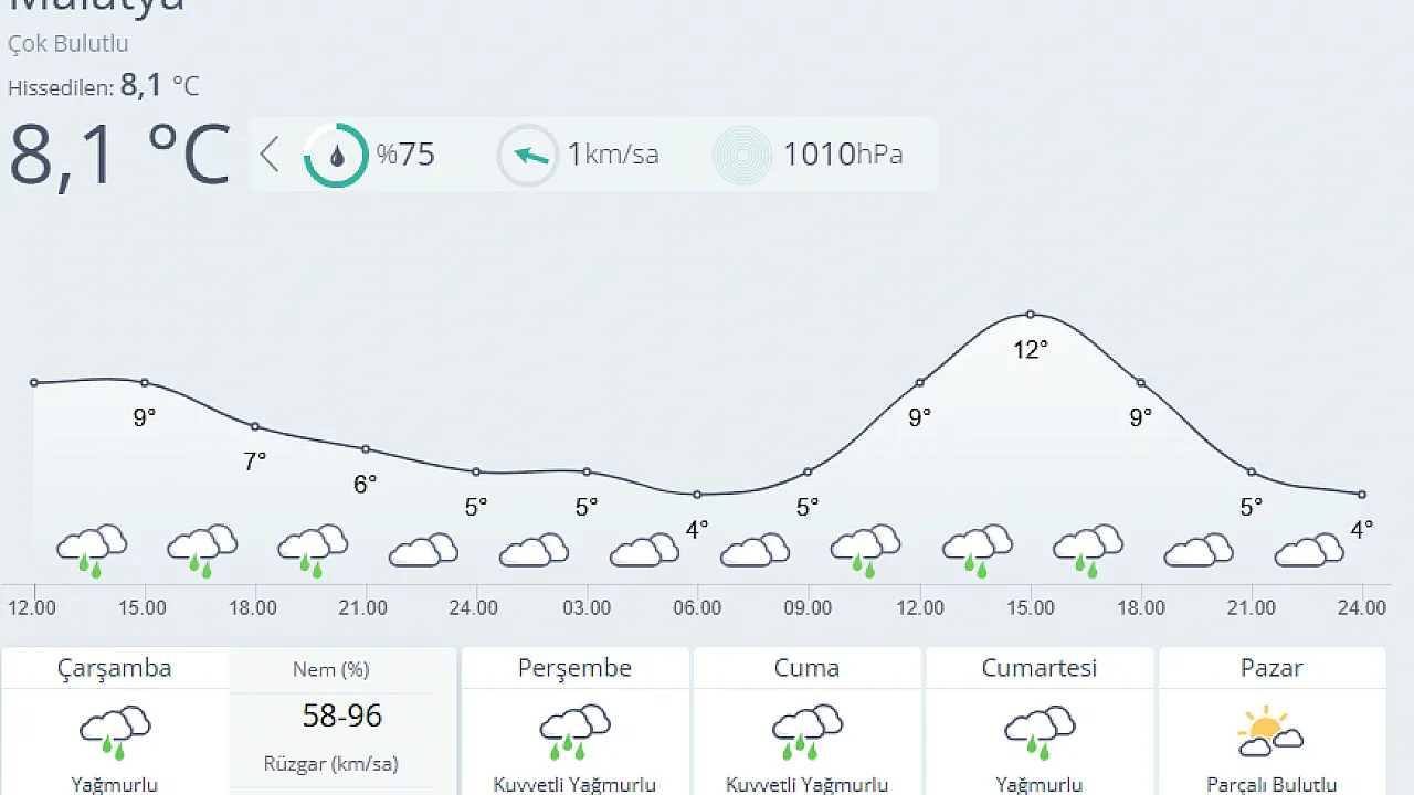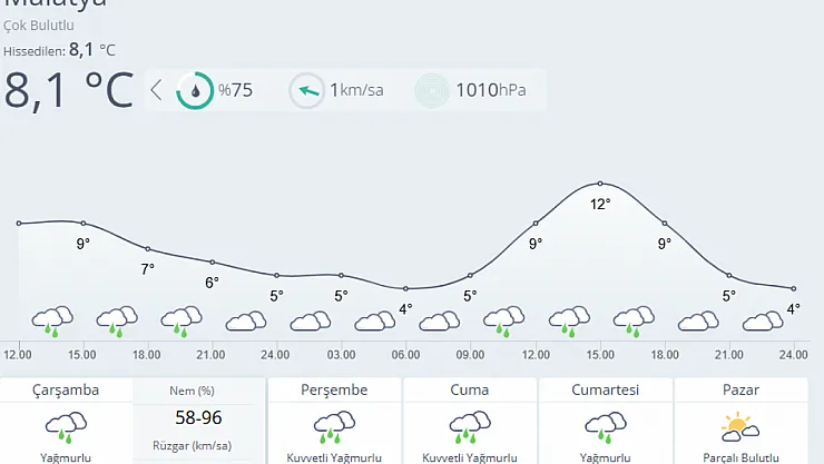 Haftalık tahminlere göre Çarşamba günü yağmurlu hava beklenirken, sıcaklık 4 ile 12 derece arasında olacak. Perşembe ve Cuma günleri ise kentte kuvvetli yağmur etkili olacak, sıcaklıklar 4 ila 12 derece aralığında seyredecek.