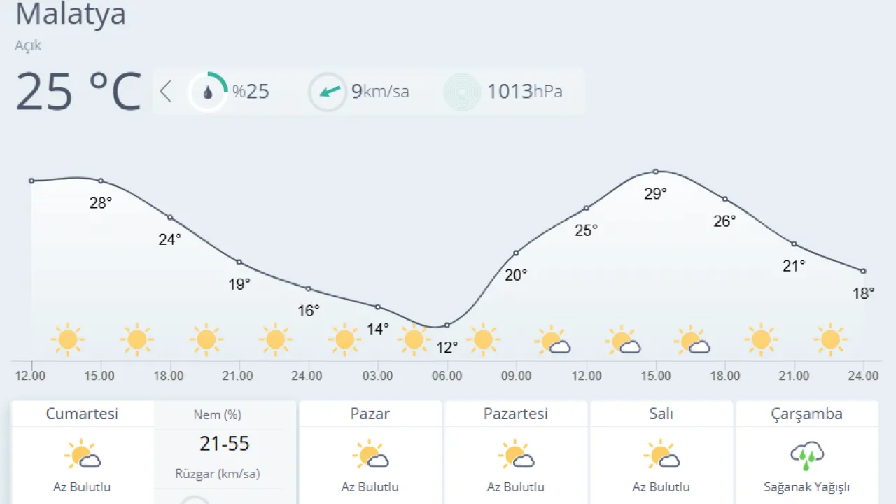 Haftanın en önemli değişikliği ise çarşamba günü yaşanacak. Meteoroloji raporuna göre, Malatya’da sağanak yağış bekleniyor. Sıcaklık ise en düşük 11, en yüksek 26 derece olacak.