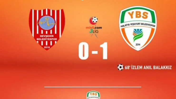 TFF 3.Lig 1.Grup mücadelesinde Malatya Yeşilyurt Belediyespor 68.dakikada İzlem Anıl Balakkız’ın kaydettiği gol ile Nevşehir Belediyespor’u 10 mağlup etti.