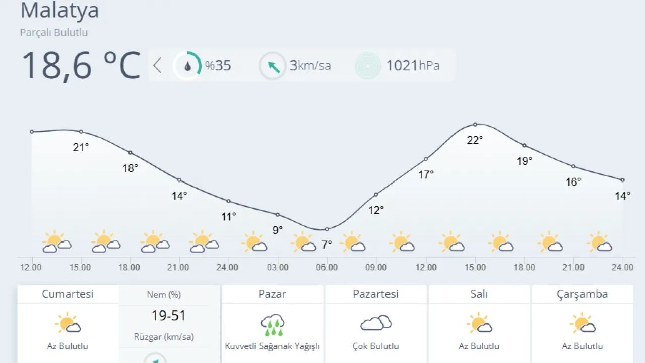 Cumartesi günü hava az bulutlu olacak, sıcaklıklar 7 ila 22 derece arasında değişecek. Ancak pazar günü Malatya’da kuvvetli sağanak yağış bekleniyor. Yağışlarla birlikte hava sıcaklığının 8 ila 22 derece arasında olması tahmin ediliyor.
