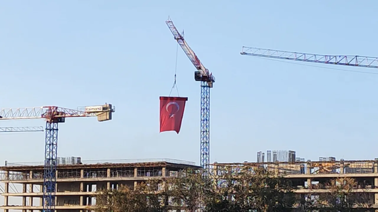 Operatör, vinç ucuna astığı dev Türk bayrağını akşam saatlerinde gökyüzünde dalgalandırarak kutlamaya renk kattı. Görüntüyü izleyen vatandaşlar, operatörün bu davranışına alkışlarla karşılık verdi.