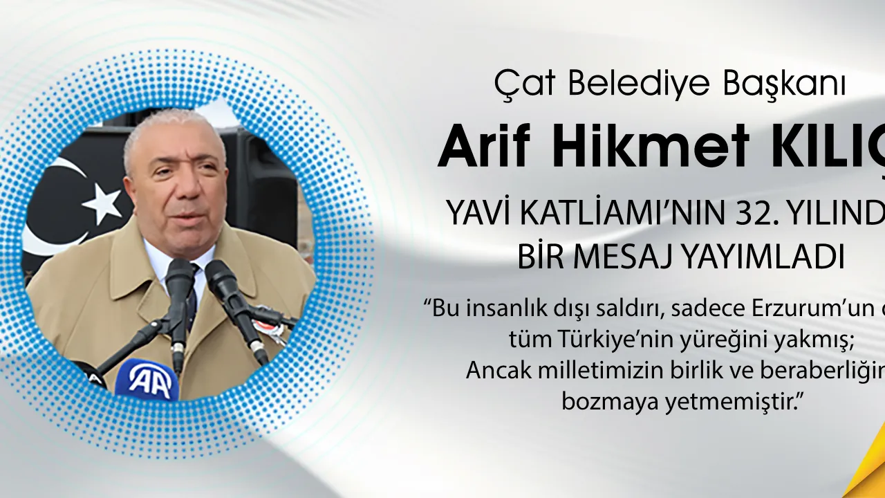 Çat Belediye Başkanı Arif Hikmet Kılıç, Yavi Katliamı’nın 32. yıldönümü dolayısıyla yayımladığı anma mesajında birlik, beraberlik ve vatan sevgisi vurgusu yaptı. Başkan Kılıç mesajında şu ifadelere yer verdi: