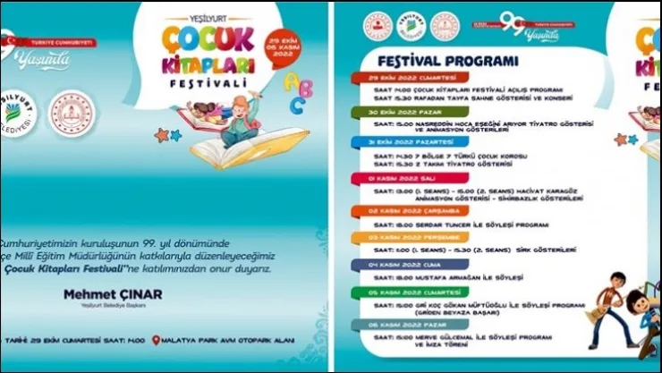 Türkiye Cumhuriyetinin 99.Kuruluş Yıldönümü etkinliklerine yakışacak güzel bir organizasyon planladıklarını ifade eden Yeşilyurt Belediye Başkanı Mehmet Çınar, “29 Ekim Cumhuriyet Bayramı kutlama programlarına dev bir organizasyonla katkı sunacağız. Eğitim projelerimizin başarıya ulaşmasında katkılarını esirgemeyen İl ve İlçe Milli Eğitim Müdürlüklerimizle işbirliği halinde çocuklarımızı daha fazla kitapla buluşturmak amacıyla ‘Yeşilyurt Çocuk Kitapları’ Festivali düzenleyeceğiz. Malatya’da ilk kez düzenlenecek olan bu festivalimizi 29 Ekim ile 6 Kasım günleri arasında çocuklarımızla buluşturacağız. 30’dan fazla yayınevi ile çok sayıda yazarın katılacağı festivalimizde çocuklarımıza yönelik tiyatro, animasyon ve sirk gösterilerinin yanı sıra söyleşiler ve imza günleri organize edeceğiz. Malatya Park AVM’nin arka kısmındaki alanda bir hafta sürecek olan festivalimizin her gününde farklı bir organizasyon ve etkinlik yer alacak. 29 Ekim Cumartesi günü saat 14:00’deki açılış programının ardından başlayacak olan festivalimizin büyük ilgi göreceğine yürekten inanıyorum. Festivalimize tüm çocuklarımızı bekliyoruz. Renkli ve coşku dolu geçmesini arzu ettiğimiz festivalimizin hayata geçmesinde katkı sunan herkese şahsım ve tüm çocuklarımız adına teşekkürlerimi sunuyorum.” diye konuştu.